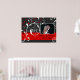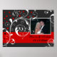 Elegant floral scroll leaf black, red flourish wedding photo poster print, featuring white scroll leafs, swirls and curls and red dots on black background. There is a red band with your text to the bottom. Classy, stylish and chic design with your photo.