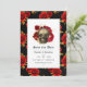 Crimson red, black and gold gothic wedding save the date featuring a skull decorated with red roses and a dramatic rose pattern.