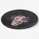 A spooky chic Halloween party design featuring a floral skull illustration topped with pink and purple watercolor flowers on a smoky black background.