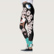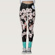 Floral Spring Garden with Singing Birds on these leggings feature pink blossoms and white birds with scalloped aqua border on black background.