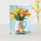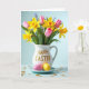 Designed with a spring tabletop scene, the card centers on a white ceramic pitcher that feels like it was set down for two close friends to admire together. Across the pitcher, raised gold lettering sits prominently in the middle, forming a cheerful seasonal greeting. A full bouquet spills out above it, mixing golden star-shaped blooms, soft pink cup-like flowers, and a few small deep-blue spikes tucked into leafy green stems. The gentle lighting and airy blue background give the arrangement a tender, shared-moment feel, like a quiet glance exchanged over fresh flowers 🌷. Below the pitcher, a pale blue saucer holds two smooth egg-shaped forms in pastel yellow and pink, their glossy highlights suggesting careful placement side by side 🐰. Tiny gold confetti-like dots are scattered around the base, catching light in little flashes. The surface beneath everything is a calm, light cerulean blue with the gold accents gleaming against the cool tones.