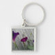 The pretty image on the small (1.38"), premium, square key chain consists of pink-purple Morning Glory wildflowers perched along a grey, wooden fence on a sunny summer's morn.