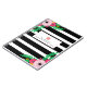 A spiral notebook for teachers featuring a black and white stripes design on front with floral design at bottom right and top left. Front features custom text under illustration of a pink apple.