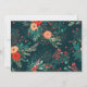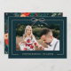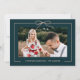 Beautiful dark teal holiday floral Christmas photo card features a pretty delicate blush bow and festive red and blush orange colourful botanical pattern with a centre framed photo.