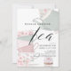 This elegant bridal shower tea invitation features a white background with a teapot and tea cups with flowers. The reverse side features a white background with blush pink stripes. Personalize it for your needs. You can find matching products at my store.