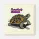 A stylized illustration of a tortoise, featuring a vibrant floral pattern of yellow and grey hues on its shell, is depicted in a walking pose against a serene pale-yellow backdrop. The artwork exudes a peaceful and whimsical ambiance, evoking the aesthetic of vintage printmaking or linocut techniques.