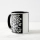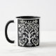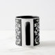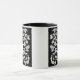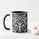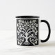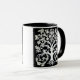 Mug in a stylized, flower and leaf, tree of life design in white on a black background