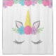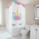 Cute unicorn face shower curtain with flowers in purple, pink and teal.
