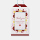 The front design shows a classic elegant wedding favour gift tag with customizable names and date in classic typography with a floral frame around it containing burgundy,pink and yellow flowers. The design is colourful elegant and depicts the joy of the celebration. This vibrant wedding favour gift tag will be an irresistible item for your wedding.