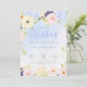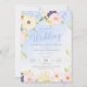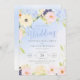 Sweet spring flower bouquet with pink roses, blue hydrangeas, purple and yellow flowers on a watercolor blue background. Elegant modern script typography with delicate swirls elements. Soft pastel shades of yellow, blue and pink are the main colours of this wedding suite. Personalize the text, add wedding information and make this invitation yours.