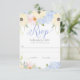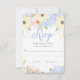 Sweet spring flower bouquet with pink roses, blue hydrangeas, purple and yellow flowers on a watercolor blue background. Elegant modern script typography with delicate swirls elements. Soft pastel shades of yellow, blue and pink are the main colours of this wedding suite.