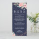 Floral Watercolor Navy Wedding Menu. Beautiful wedding menus with white text on navy blue adorned with a digitally adjusted print of hand-painted watercolor floral arrangement in shades of pink, coral, green, and blue-grey. Personalize with your wedding menu. Please visit our store, Austen & Grace, to view matching products and our growing designer ranges. Contact us if you require extra matching products or any assistance via the contact button or email directly at contact@austenandgrace.com
