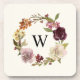 Customizable coaster featuring a burgundy, pink and white floral watercolor wreath with green foliage accents. This elegant wreath frames a classic black monogram. Easy to personalize and makes a great gift.