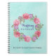 A personalized wedding planner notebook. A beautiful botanical themed illustration with a circular wreath of pretty watercolor flowers in pink and purple with green leaves in between. The floral design is made up of pink peonies and purple anemones. The background is a soft mint green watercolor texture.