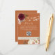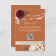 Elegant, rustic string lights, floral burgundy and orange wedding details card with QR code and website.