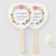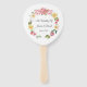 This wedding paddle fan is shown in a lovely watercolor floral wreath print of peonies and daffodils, text is shown in a slate grey colour.