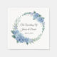 This wedding paper napkin is shown in a lovely watercolor floral wreath print of blue hydrangeas, text is shown in a slate grey colour.