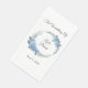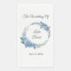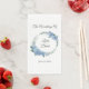 This wedding guest towel paper napkin is shown in a lovely watercolor floral wreath print of blue hydrangeas, text is shown in a slate grey colour.