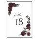 Printed on both front and back for visibility from every angle, the design sits against a clean white background that enhances the deep burgundy florals and intricate skull details. Perfect for gothic weddings, dark romantic receptions, Halloween weddings, and alternative bridal celebrations, this table number adds dramatic sophistication to your reception décor.