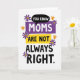 Designed with a tall, graphic layout, this card stacks a cheeky message in big, easy-to-read lettering. “YOU KNOW” sits near the top inside a black speech bubble, like a quiet aside shared between friends ❤️. Just below, “MOMS” appears in white letters centred on a purple rectangle, giving it strong visual focus without feeling harsh. “ARE NOT” is placed next on a bright yellow rectangle, adding a sunny contrast that keeps the tone light and teasing. The line “ALWAYS RIGHT.” lands at the bottom in plain black type on the white background, delivering the joke with a dry, matter-of-fact finish. Around the words, small flower shapes in deep purple with yellow centres and a few orange blooms soften the geometry and add a gentle, caring touch 🌼. The blossoms are scattered near the corners and along the sides of the stacked text, framing the coloured shapes without covering any letters.