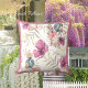 Florals Raspberry, slate blue, with greenery pale raspberry riff trim. Reverse solid with pale raspberry trim. Perfect for a front porch, sunny patio set, sunroom, bedroom. A romantic display of raspberry, slate blue and cream florals and leaves and old fashioned trim. Indoor/outdoor material options available.