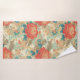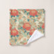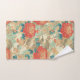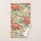 Beautiful towel set in a variety of peachy/orange, teal shades and soft browns, backed in a pale linen. Unique, elegant, and a great compliment to your beautiful home decor.