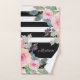 Belle aquarelle rose fleurie sur serviette à main rayée rugby noir et blanc. Personnalisé avec votre nom dans une police de script élégante.