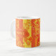 A colourful, lively two toned design with bright yellow and orange flowers against a striped yellow and orange background.