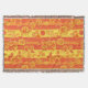 A colourful, lively two toned design with bright yellow and orange flowers against a striped yellow and orange background.