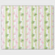 This wrapping paper features pink flamingos wearing a Santa hats palm trees on a pink and green striped background.