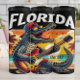 This vibrant graphic showcases a cool alligator, wearing a red baseball cap and rainbow sunglasses, shredding an electric guitar. Set against a picturesque Florida beach sunset with palm trees and flying birds, the bold "FLORIDA" text completes this whimsical, rock-and-roll-inspired design, perfectly blending iconic state imagery with musical flair.