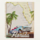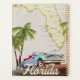 Magnifique carte illustrée de l'état de la Floride et des îles de la région dans un beau style vintage avec une voiture rétro des années 1950.