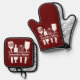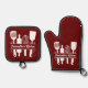 A red Oven Mitt & Pot Holder Set with flourish baking utensils monogram including whisk, spatula and rolling pin and customizable text. Perfect for Mother's Day, to make a gift to your mom, a cooking or pastry chef or for newlyweds!
