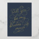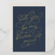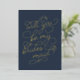 Ask your best girls to stand with you with these beautiful cards. Design features "will you be my bridesmaid" in embellished gold foil script typography with a subtle heart worked into the design, on a navy blue background. Add a custom personalized message to the back in modern handwritten script and classic serif lettering.