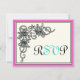 Flourish vine black pink turquoise wedding RSVP response/reply card, featuring a black vine with flowers with turquoise blue centre, a double black and hot pink border and an elegant formal script font on ivory/ecru background. A contemporary, floral design with a touch of vintage, perfect for a modern or traditional spring or summer wedding. This stylish design can be used for other special occasions such as birthdays, engagements or anniversaries.