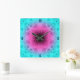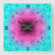 Digital art design in an abstract symmetrical pattern of shades of light blue, pink and purple that resembles looking down into the centre of a flower. Custom-designed blue numbers at hours 3, 6, 9, 12.