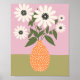 Flower Arrangement In Vase 02 - white daisies and green leaves in orange vase on a pink and green background.