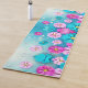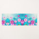 A vibrant yoga mat adorned with colourful flowers in shades of pink and blue, set against a soft, gradient background.