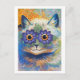 A fine art postcard with an animal illustration of a long-haired cat with purple flowers around the eyes, by the British artist Louis Wain (1860-1939). He was an illustrator best known for his drawings of cats during the art nouveau period.