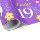 Modern text and flower design personalized age birthday girls gift wrapping paper, featuring graphic flowers and your own short name in purple, pink, white and yellow. Personalize with your own choice of name (please note not all names will fit due to the nature of the font) and age, currently reads Lauren 19, other name lengths are available if you need assistance contact me, happy to post one for your name. A great way to give a personalized touch to birthday gifts. Uniquely designed by Sarah Trett for www.mylittleeden.com
