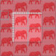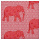 Mixed media digital graphic of an elephant against an arabesque tiled background fabric - Flower pattern in shades of deep red to coral red with a coral red and white background
