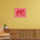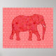 Mixed media digital graphic of an elephant against an arabesque tiled background - Flower pattern in shades of deep red to coral red with a coral red and white background