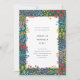 The invitation is framed by a dark green border, which adds a sense of depth and sophistication to the design. The border surrounds a plethora of tiny wildflower illustrations in a variety of bright and cheerful colours. These delicate illustrations add a playful touch to the design, as they depict the wildflowers in full bloom, swaying in the gentle breeze.