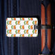 White monogrammed luggage tag with a flower-wearing fox inside a laurel wreath decorated with matching flowers. Add your child's name and monogram. The back features a pattern of foxes wearing red and white flowers.