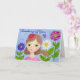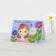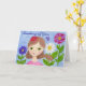 Pretty painting of a girl in a flower garden with accents of blue, pink, purple and white, on a thinking of you card.
