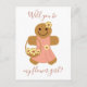 A postcard that asks “Will you be my flower girl?”. It shows the cartoon drawing of a gingerbread person, decorated with a pink dress and a basket of yellow flowers.