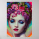 A beautiful ai-generated art nouveau portrait of a woman in a hat made of flowers, surrounded by a rainbow aura. It would be a beautiful addition to a boudoir or a girl's bedroom.