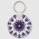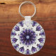 Flower mandala keychain with a kaleidoscopic pattern created from a watercolor and ink drawing of an abstract lotus flower in blue, violet and black.