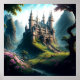 This is a poster of a beautiful, imaginative, classic fairy tale castle in a lush, green meadow with pink flowers. It was made using Leonardo.ai.