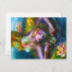 Fantasy card with a beautiful and colourful flower mermaid swimming through the magic underwater forest.